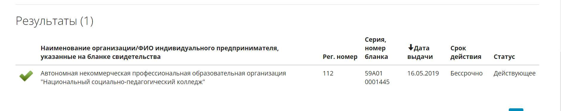 АНПОО «НСПК» — колледж с бессрочной лицензией. Проверить ее можно в реестре лицензий федеральной службы по надзору в сфере образования и науки: введите в поле «ИНН» ИНН колледжа — 5904354193 — и нажмите «Поиск».